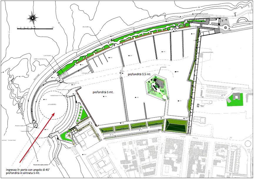 L’entrata del porto è segnalata da faro rosso e verde lampeggiante. Entrando con rotta 45° si allineano due fari rosso e verde a luce fissa.